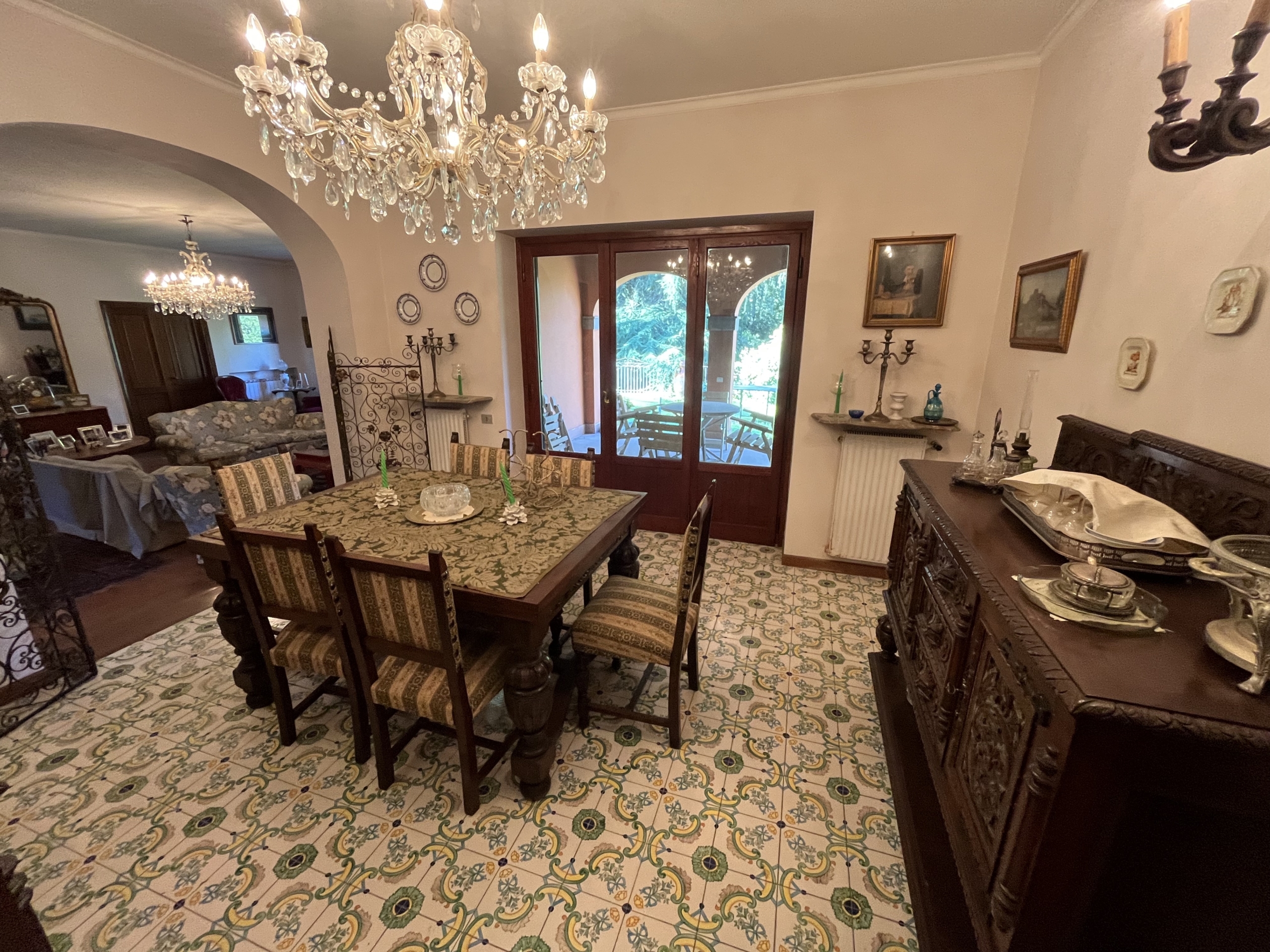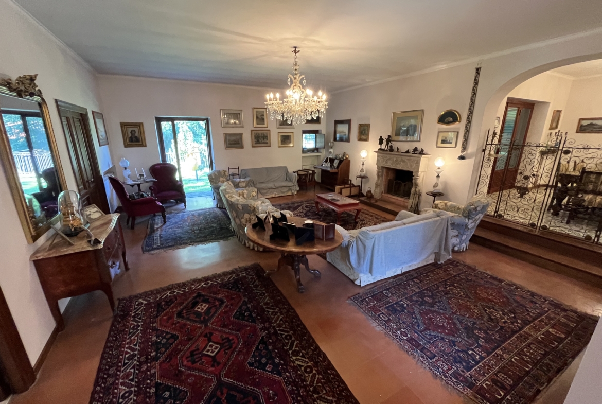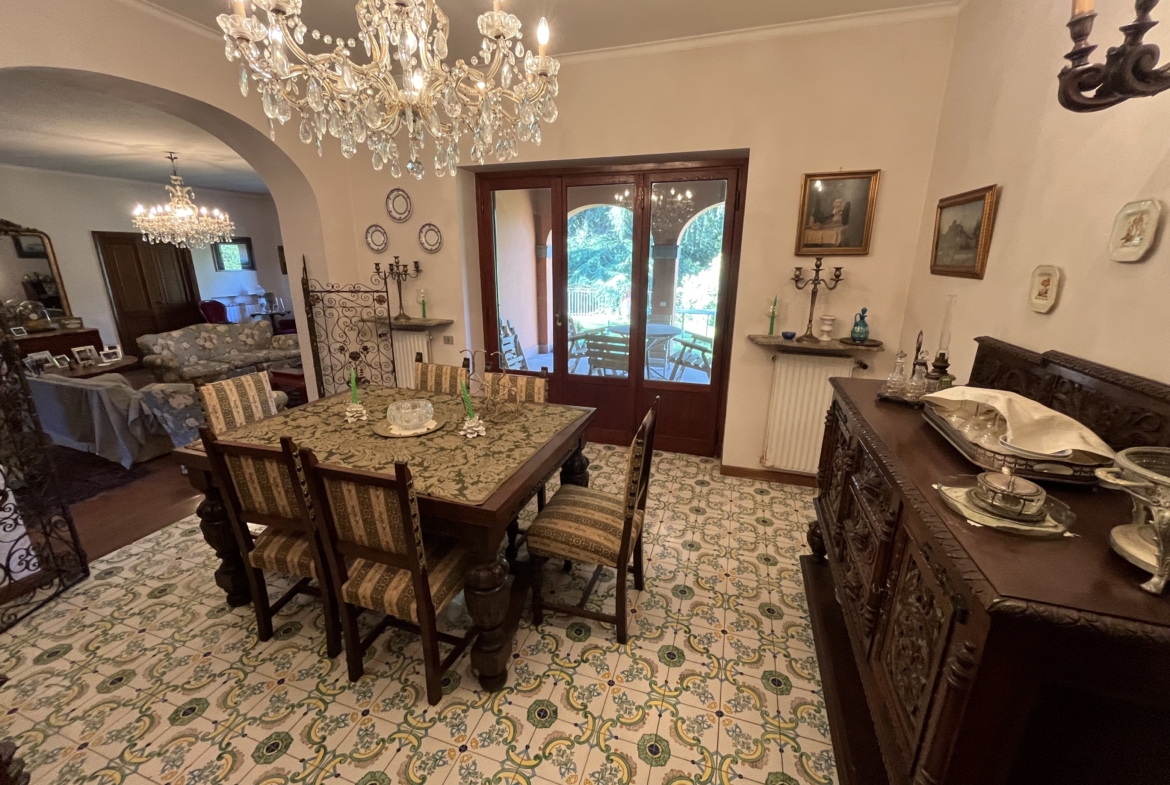 Al piano terra, varcato un antico portone a volta, si entra nella rappresentanza, distribuita in due grandi saloni entrambi con camino, caratterizzata da pavimenti adornati da maioliche di Vietri e cotto, con ampie vetrate che affacciano su una terrazza giardino. Separata due gradini si distingue l’elegante zona pranzo, collegata ad un patio esterno. Sempre al piano terra troviamo un bagno ospiti, camera e bagno di servizio, cucina, tinello e studio.