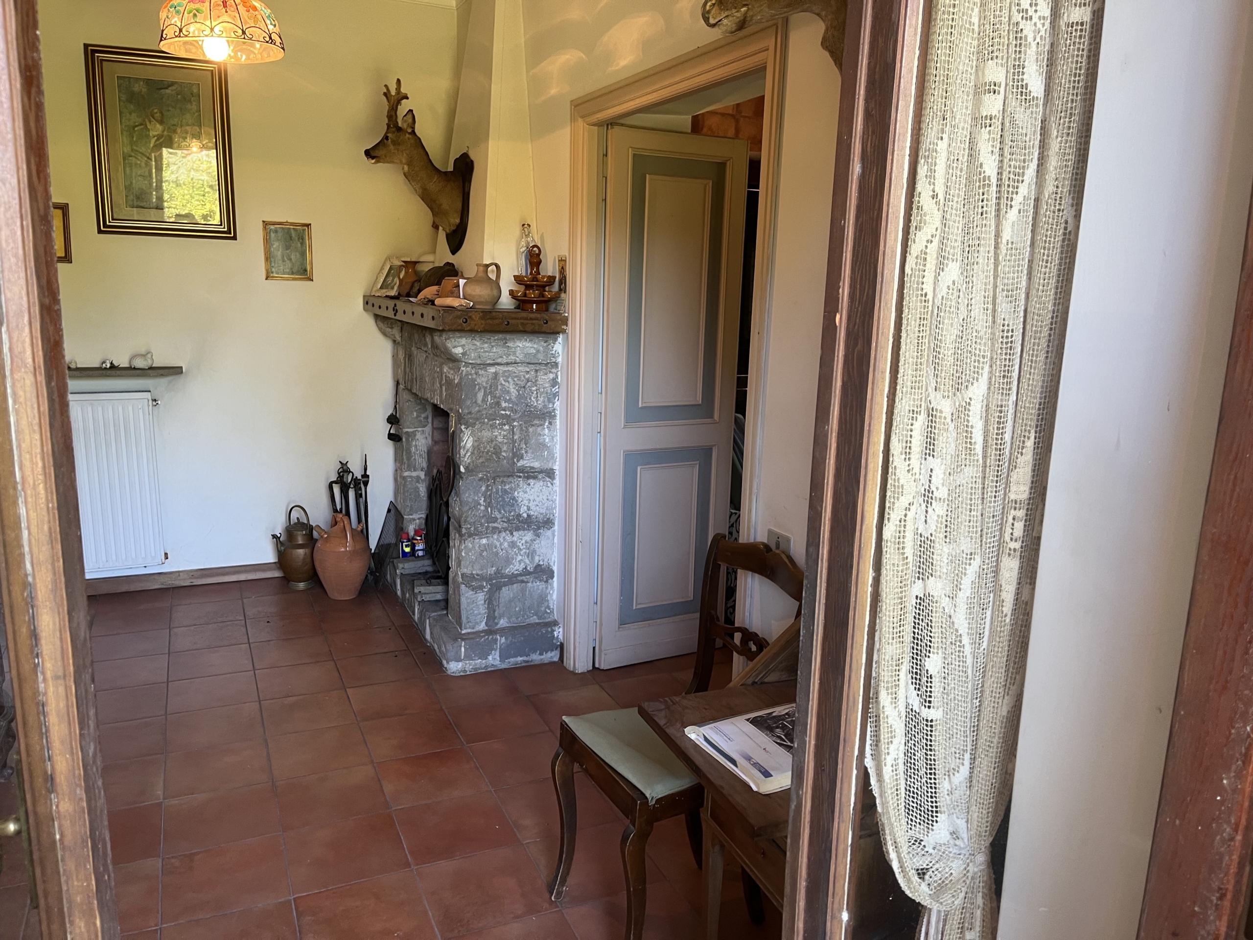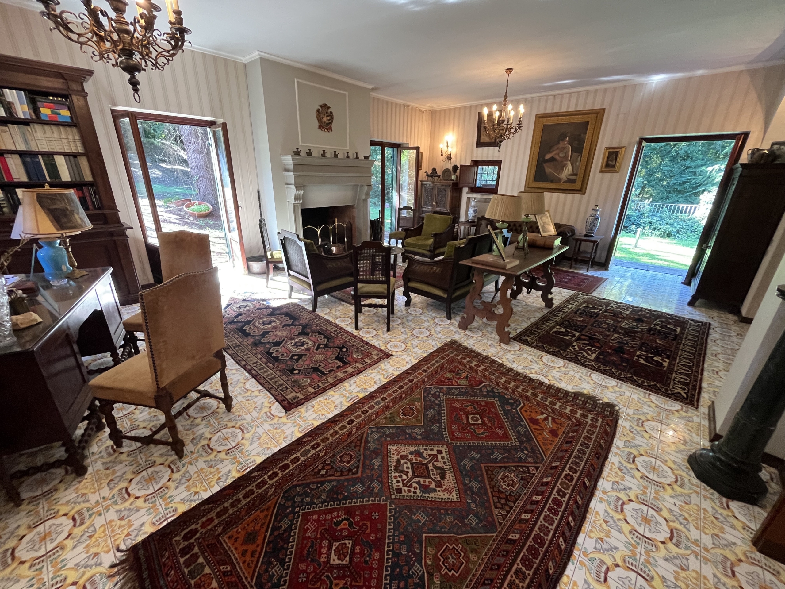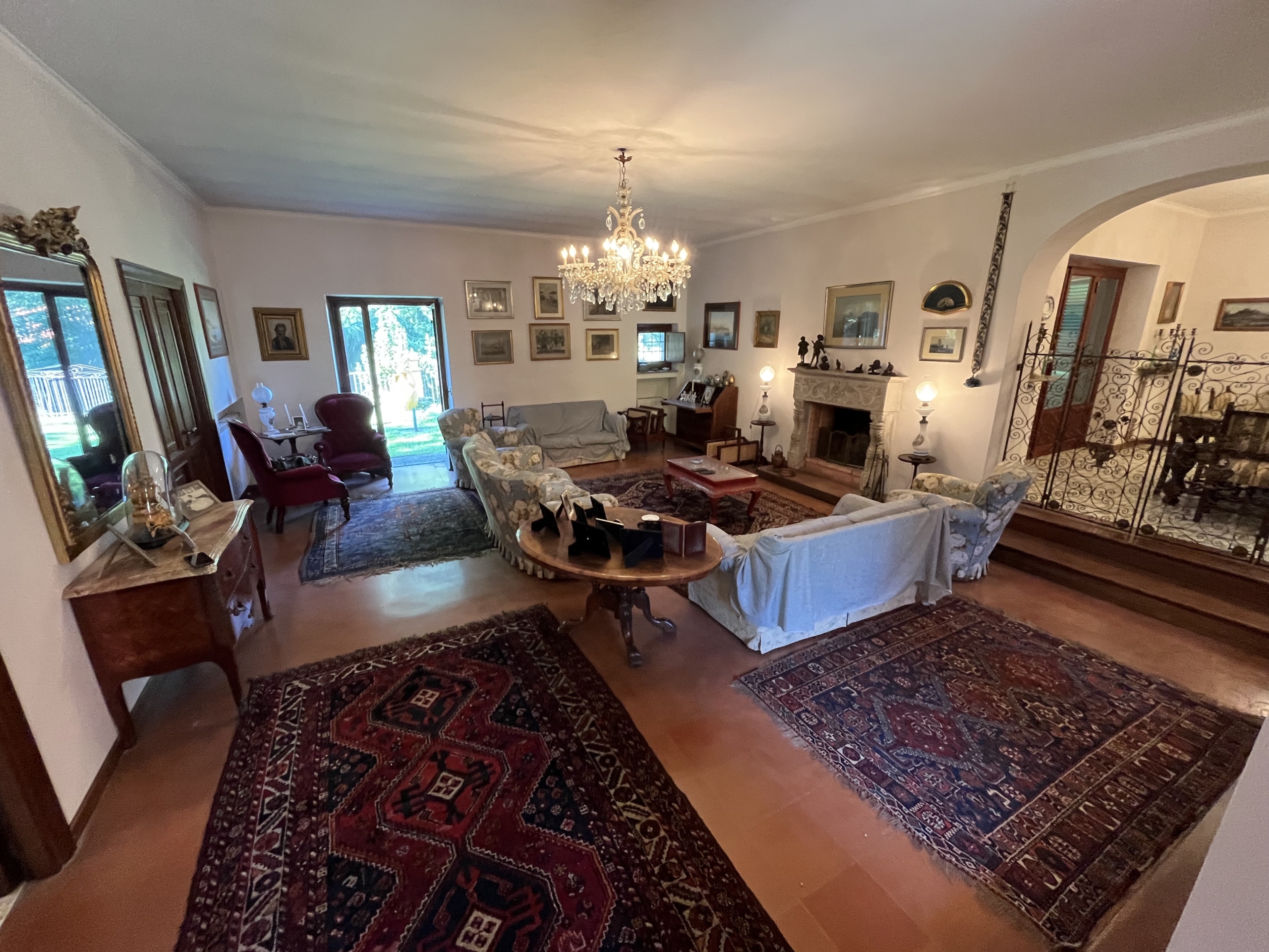 Al piano terra, varcato un antico portone a volta, si entra nella rappresentanza, distribuita in due grandi saloni entrambi con camino, caratterizzata da pavimenti adornati da maioliche di Vietri e cotto, con ampie vetrate che affacciano su una terrazza giardino. Separata due gradini si distingue l’elegante zona pranzo, collegata ad un patio esterno. Sempre al piano terra troviamo un bagno ospiti, camera e bagno di servizio, cucina, tinello e studio.