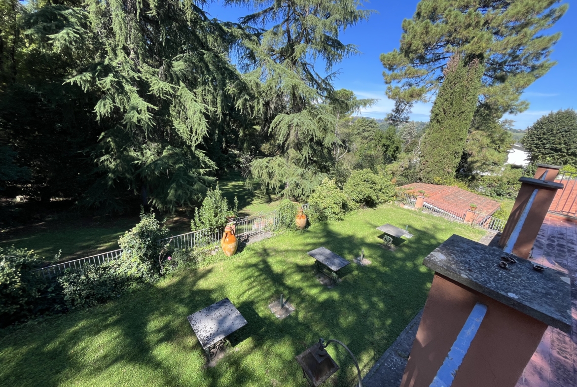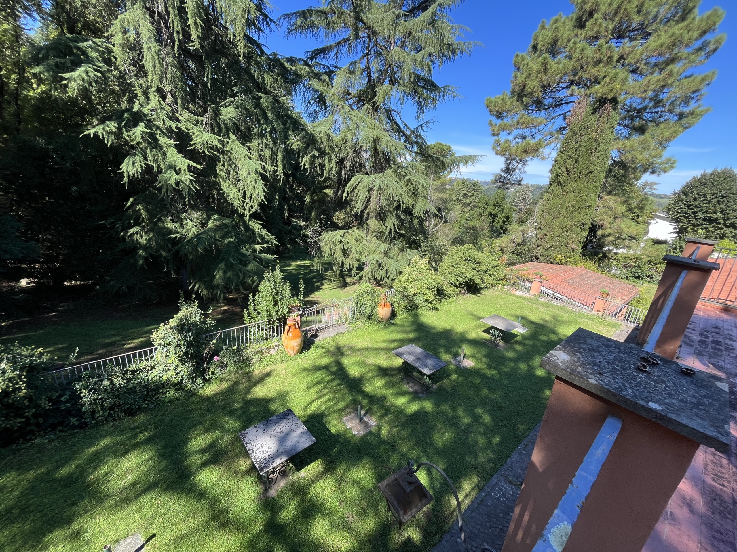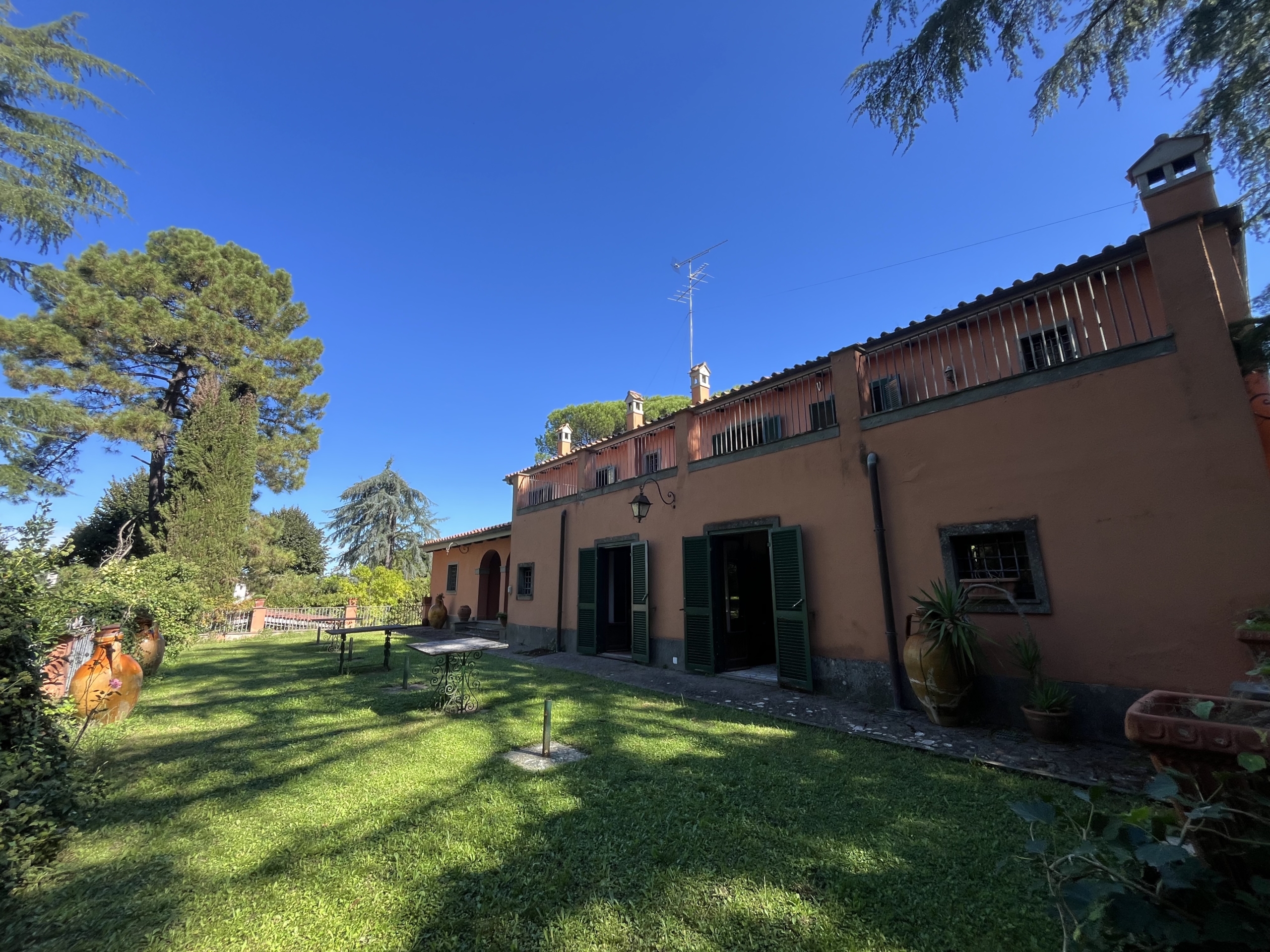 Il primo piano, raggiungibile da due diverse scale, una in marmo e l’altra in legno, ospita tutta la zona notte composta da 5 camere da letto e 4 bagni, oltre ad una grande terrazza da cui si gode una vista magnifica sul giardino.